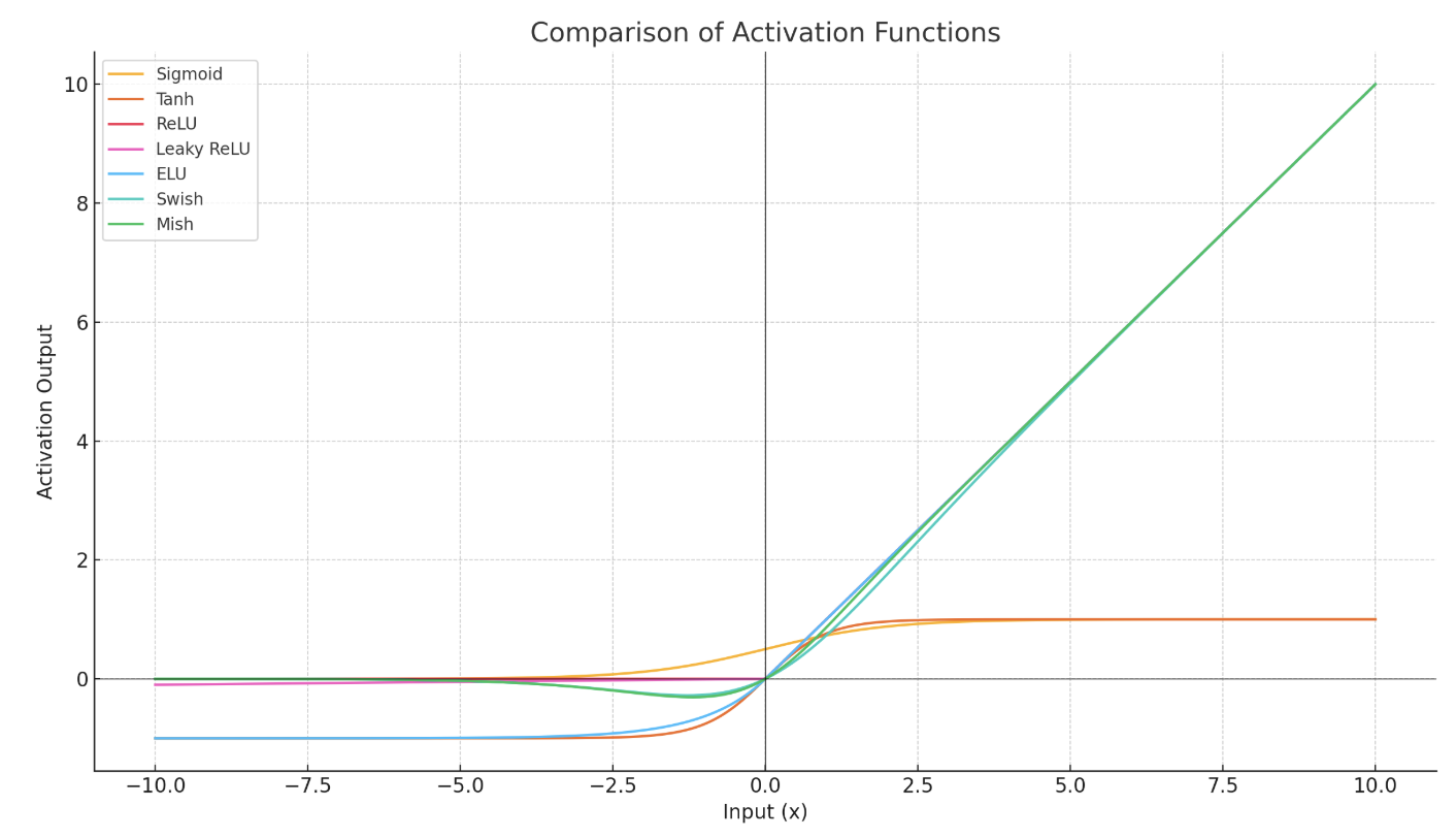 - 공식: $\text{Mish}(x) = x \cdot \tanh(\ln(1 + e^x))$